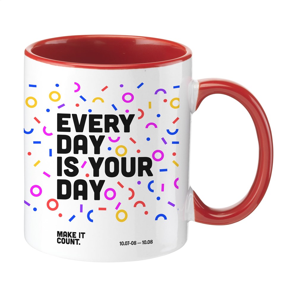 Hochwertiger Becher aus Keramik mit farbiger Innenseite. Die Farbe des großzügigen Henkels gleicht der Farbe der Innenseite, was für einen spezielen Effekt sorgt. Die perfekte Tasse für alle Drucke in Full Colour, auch Fotos. Spühlmaschinegeeignet. Fassungsvermögen 350 ml.