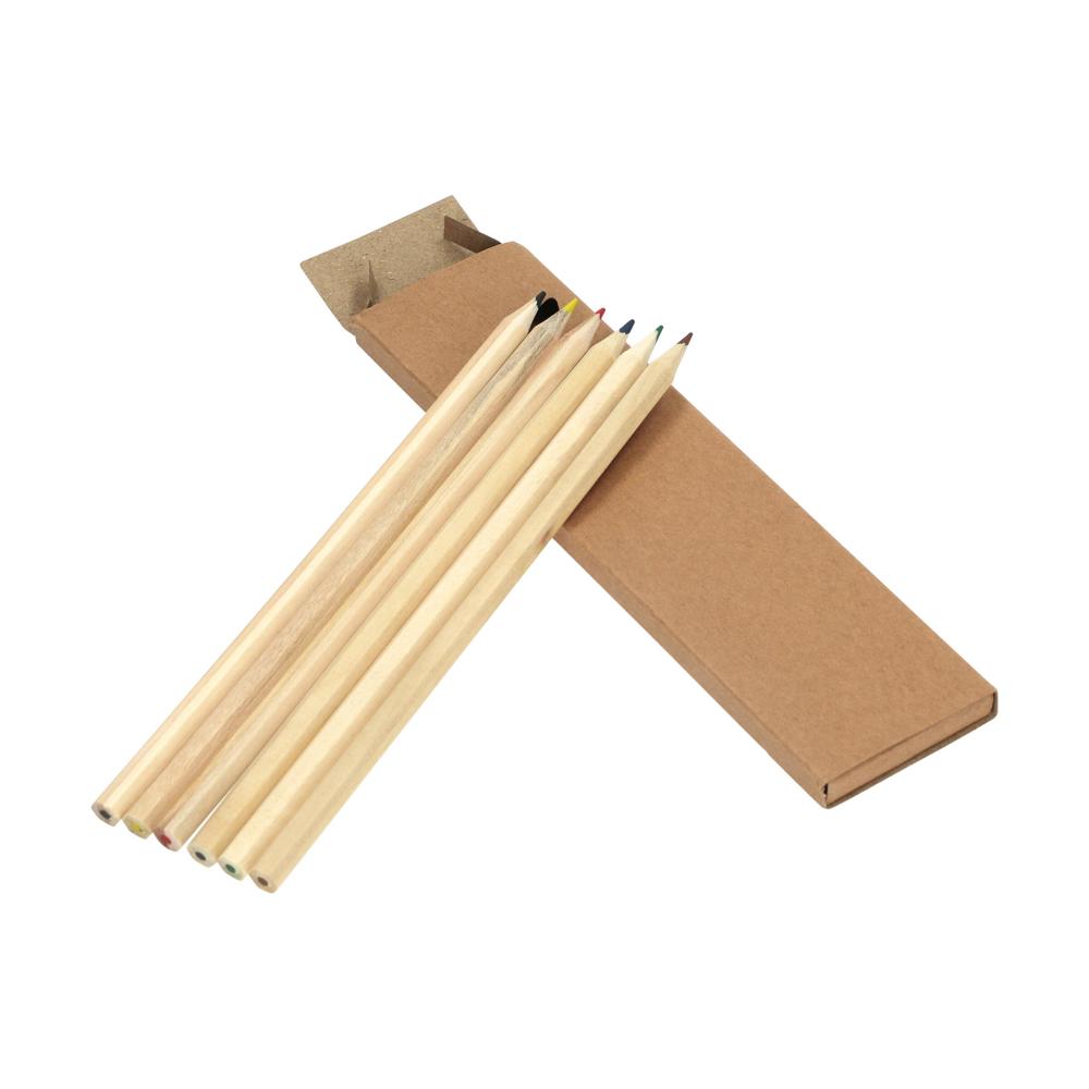 Lange Farbstifte, unlackiert und als 6er Set im Karton verpackt. Die Stifte sind alle sechseckig.