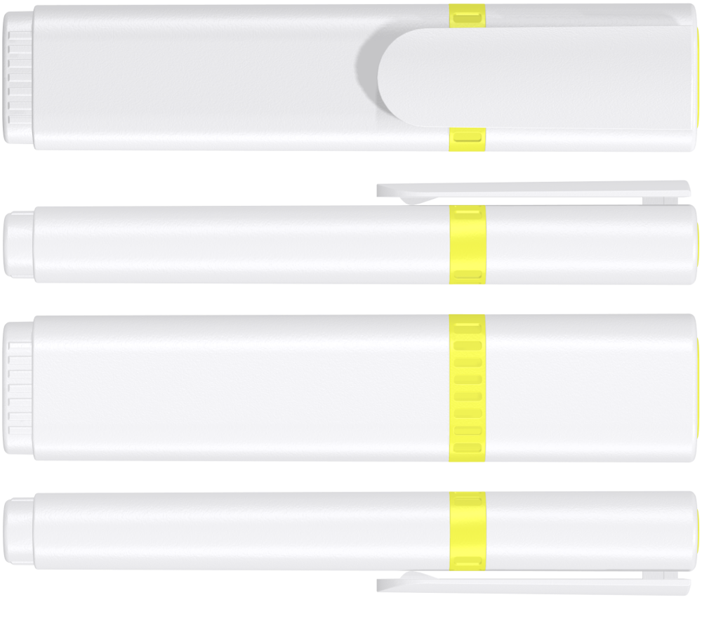 Textmarker mit Kunststoffgehäuse, Kappe und Clip in weiß. Mundstück mit Zierring und Stopfen in der Schreibfarbe. Standardfarben gelb, grün, magenta, blau, orange.
