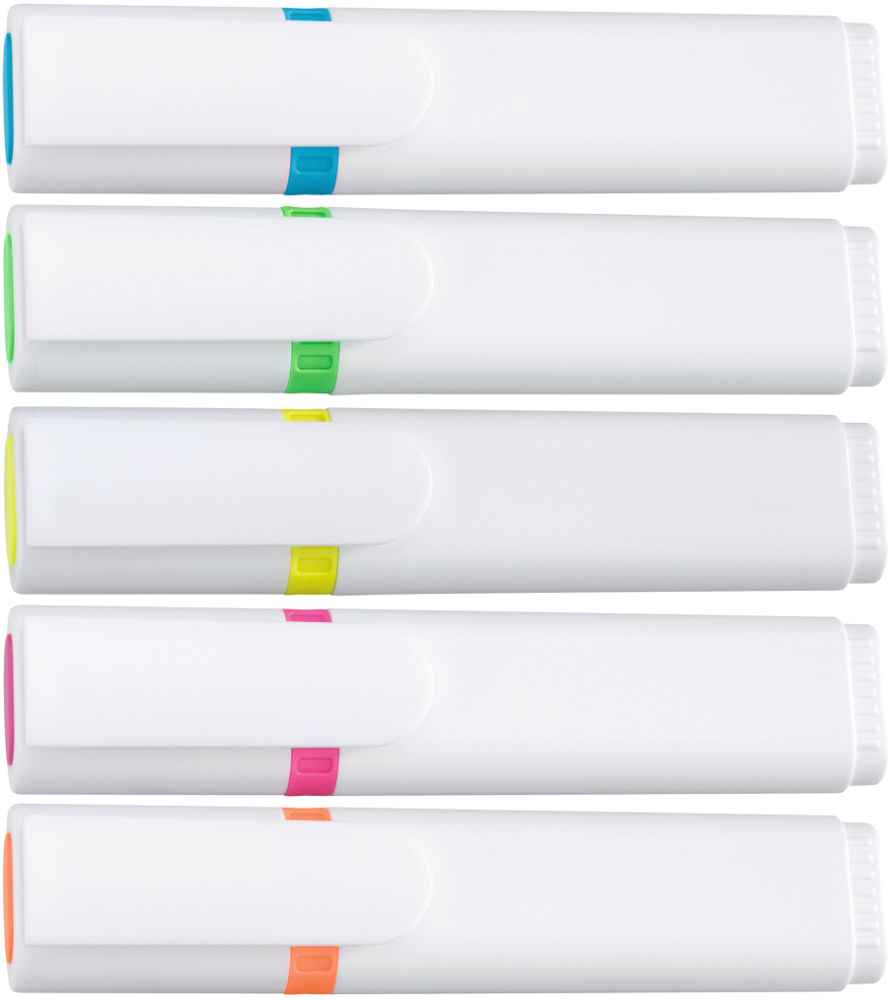 Textmarker mit Kunststoffgehäuse, Kappe und Clip in weiß. Mundstück mit Zierring und Stopfen in der Schreibfarbe. Standardfarben gelb, grün, magenta, blau, orange.