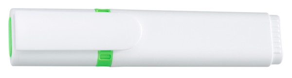 Textmarker mit Kunststoffgehäuse, Kappe und Clip in weiß. Mundstück mit Zierring und Stopfen in der Schreibfarbe. Standardfarben gelb, grün, magenta, blau, orange.