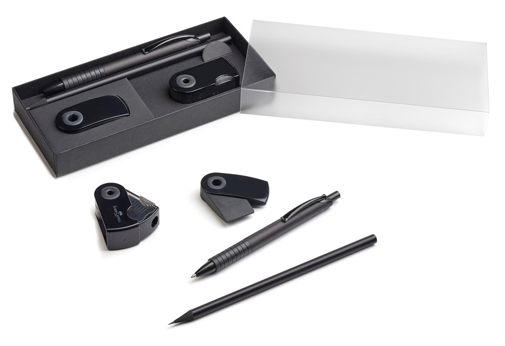 Set bestehend aus dem Kugelschreiber Basic Alu mit schimmerndem Schaft aus Aluminium in schwarz und dem edlen Design Bleistift aus schwarz durchgefaerbtem Holz. Ergaenzt durch den Radierer (PVC-frei) und die Spitzdose Sleeve mini. Alles in elegantem Schwarz. Eingelegt in einer Geschenkverpackung mit transluzentem Schuber.