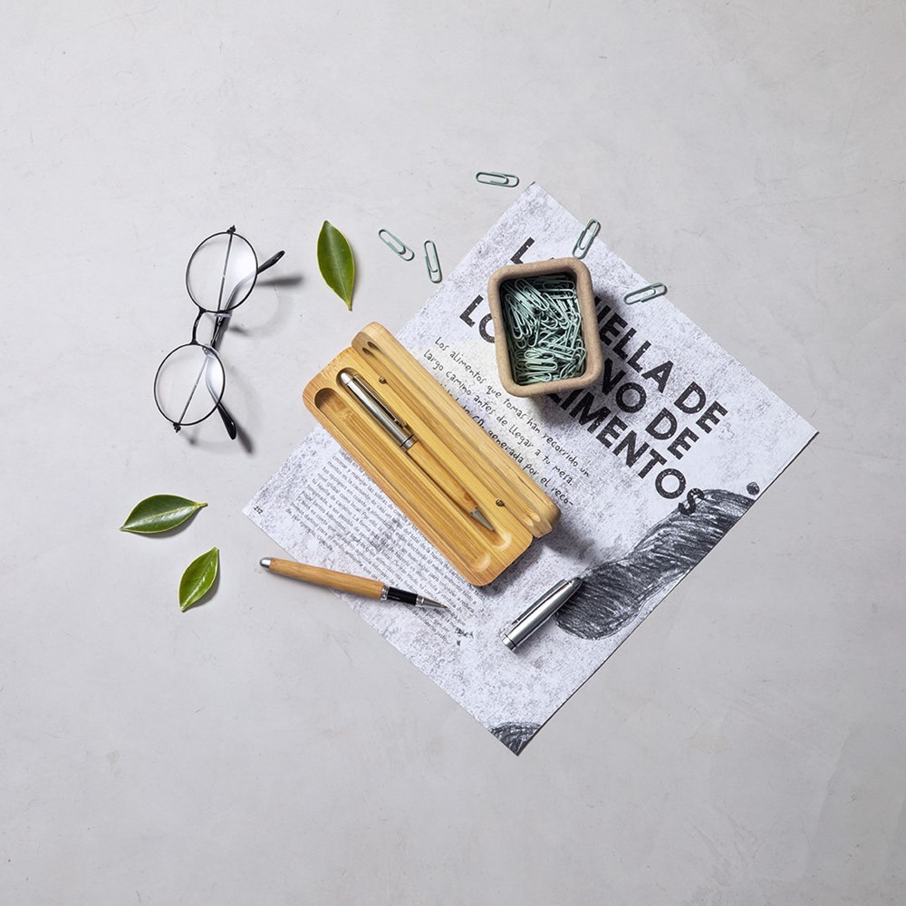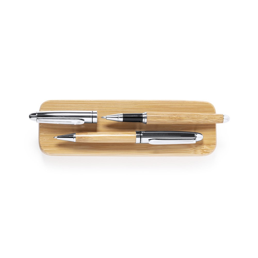 Linie "Natur" Kugelschreiber- und Rollerpenset. Hergestellt aus einer Kombination von Bambus und Metall, um die Verwendung von natürlichen Rohstoffen zu fördern und Schadstoffemissionen zu reduzieren. Kugelschreiber mit Drehmechanik und blauer Tinte. Rollerpen mit Kappe, Gel-Tinte in Blau und Jumbo-Mine. Präsentiert in einem individuellen Bambusetui.