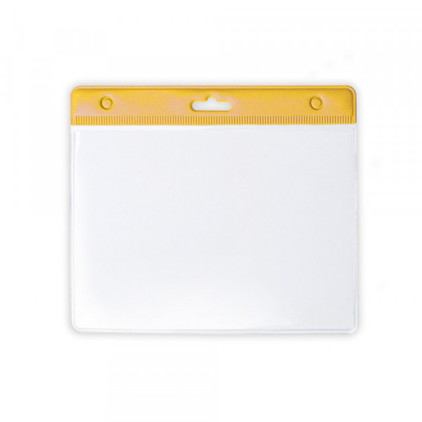 Gestanzte Ausweishülle aus PVC. Mit oberer Kante in verschiedenen Farben, transparentem Frontfenster und weißer Rückseite.