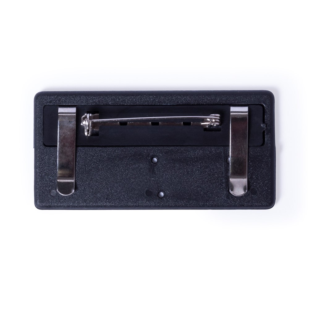 Namensschild in glänzender Ausführung. Rückseite mit doppeltem Befestigungssystem – Metallklammern und Sicherheitsstift – für sichere Justierung.