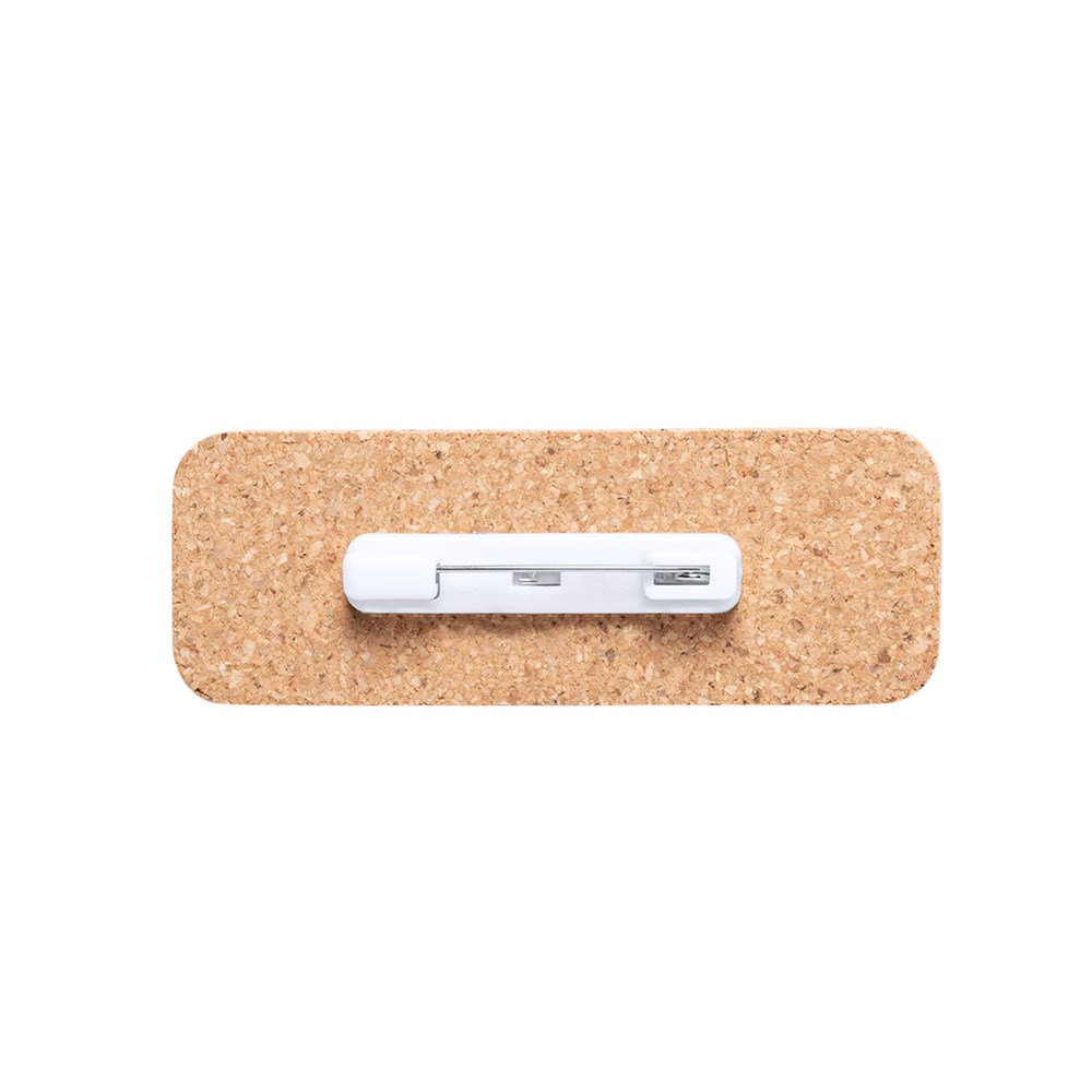 Nature Line-Identifier aus Naturkork, um die Verwendung natürlicher Rohstoffe zu fördern und Schadstoffemissionen zu reduzieren. Sicherheitsverschluss mit Sicherheitsnadel auf der Rückseite.