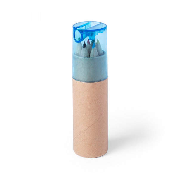 7-teiliges Set in einer zylinderförmigen Box aus Naturkarton mit transparentem Deckel in verschiedenen Farben. Enthält 6 Buntstifte mit sechseckigem Schaft in Naturfarbe und einen im Deckel integrierten Anspitzer.