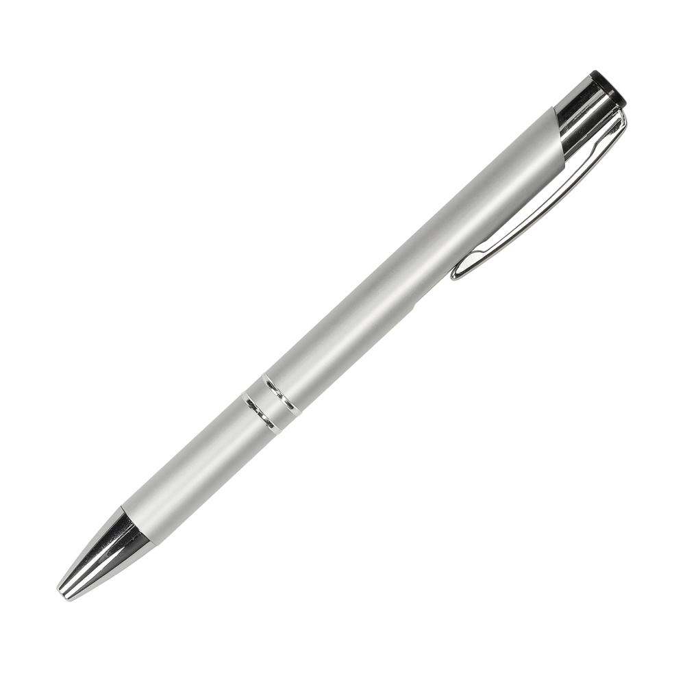Blauschreibend. Eleganter Kugelschreiber mit Druckknopf und Metall-Clip. Das metallisch schimmernde Gehäuse in diversen Farben wirkt durch die beiden silbernen Trennlinien besonders stilvoll.
