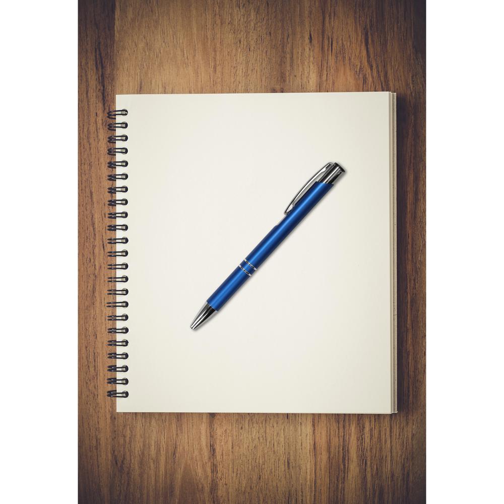 Blauschreibend. Eleganter Kugelschreiber mit Druckknopf und Metall-Clip. Das metallisch schimmernde Gehäuse in diversen Farben wirkt durch die beiden silbernen Trennlinien besonders stilvoll.
