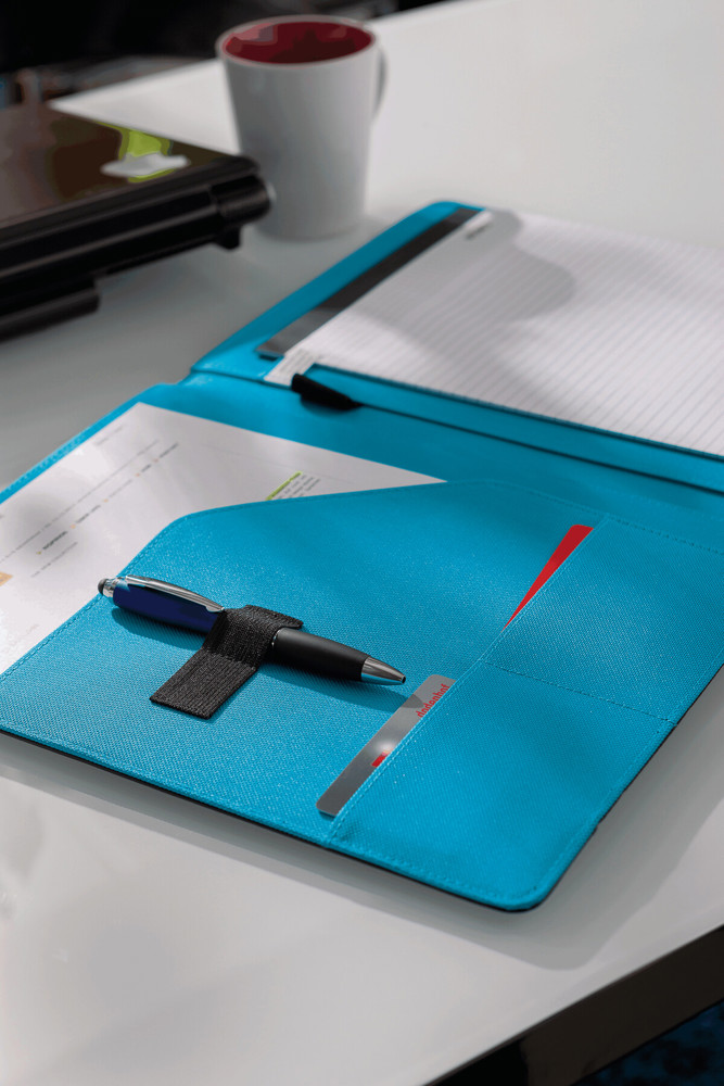 Konferenzmappe YOUNG STAR im DIN-A4-Format: Gummiband zum Verschließen, innen diverse Einsteckfächer, inkl. Schreibblock (liniert), Schlaufe für 1 Schreibgerät, innen farbig abgesetzt - außen schwarz mit farbigem Zierstreifen