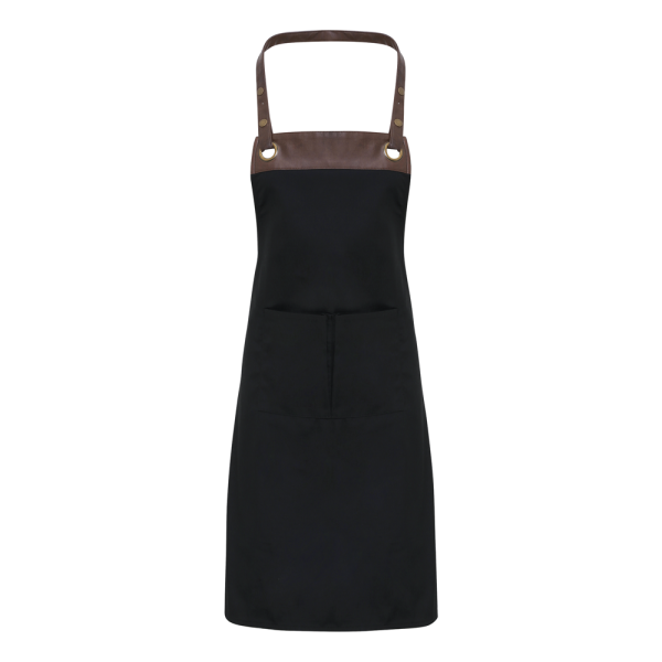 65 % Polyester/35 % Baumwolle. Oberer Teil der Schürze verziert mit einer Kunstlederborte mit 2 großen Ösen, durch die das Nackenband gezogen wird. Das Nackenband ist auf jeder Seite mit zwei Druckknöpfen verstellbar. Mittlere Tasche in der Mitte genäht, um 2 Taschen zu erhalten.