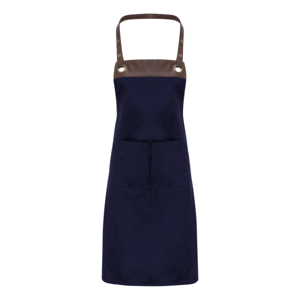 65 % Polyester/35 % Baumwolle. Oberer Teil der Schürze verziert mit einer Kunstlederborte mit 2 großen Ösen, durch die das Nackenband gezogen wird. Das Nackenband ist auf jeder Seite mit zwei Druckknöpfen verstellbar. Mittlere Tasche in der Mitte genäht, um 2 Taschen zu erhalten.