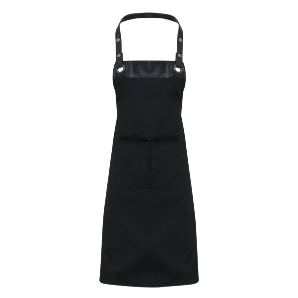 65 % Polyester/35 % Baumwolle. Oberer Teil der Schürze verziert mit einer Kunstlederborte mit 2 großen Ösen, durch die das Nackenband gezogen wird. Das Nackenband ist auf jeder Seite mit zwei Druckknöpfen verstellbar. Mittlere Tasche in der Mitte genäht, um 2 Taschen zu erhalten.