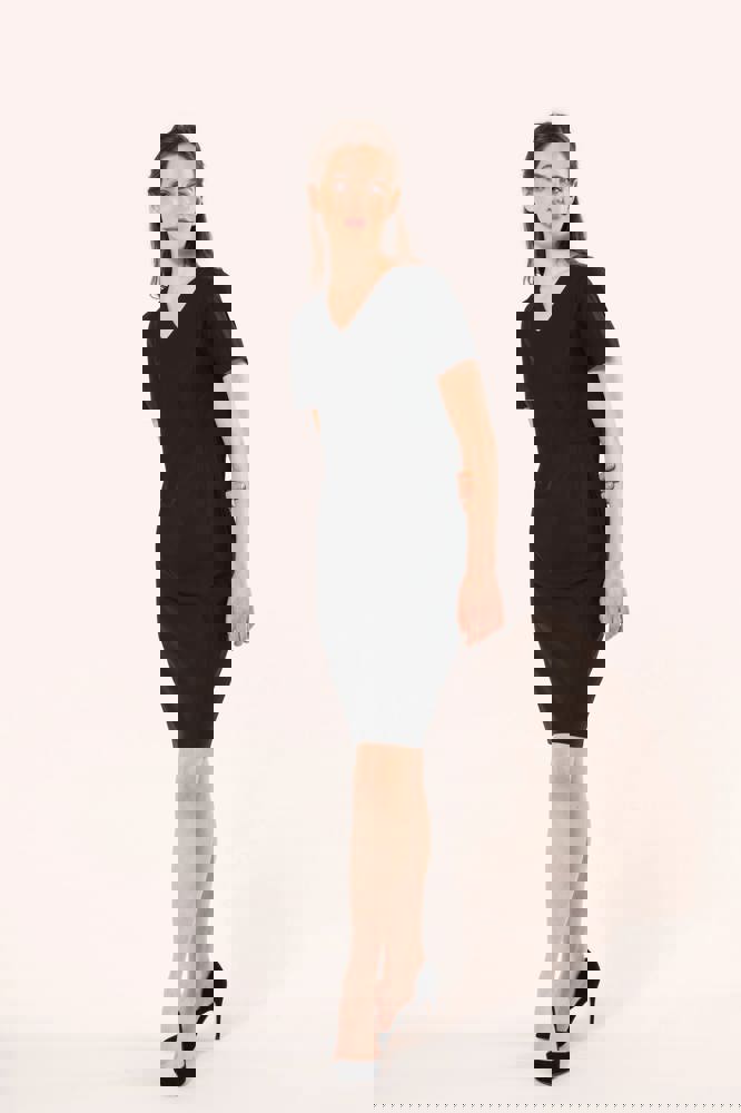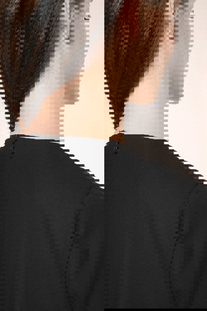 50 % Polyester/23 % Viskose/22 % Wolle/5 % Elasthan. Futter aus 100 % Stretch-Polyester auf dem Rumpf. Princess-Schnitt mit Einsatz an der Naht zum Abflachen und Verstärken. V-Ausschnitt mit gefütterten Ziersteppnähten. Verdeckter Reißverschluss am Rücken. 2 Taillenfalten am Rücken. Dehnfalte am unteren Rücken. Volant-Futter mit Schlitz. Kein Markenetikett, nur Größenkennzeichnung für eine leichtere Veredelung.