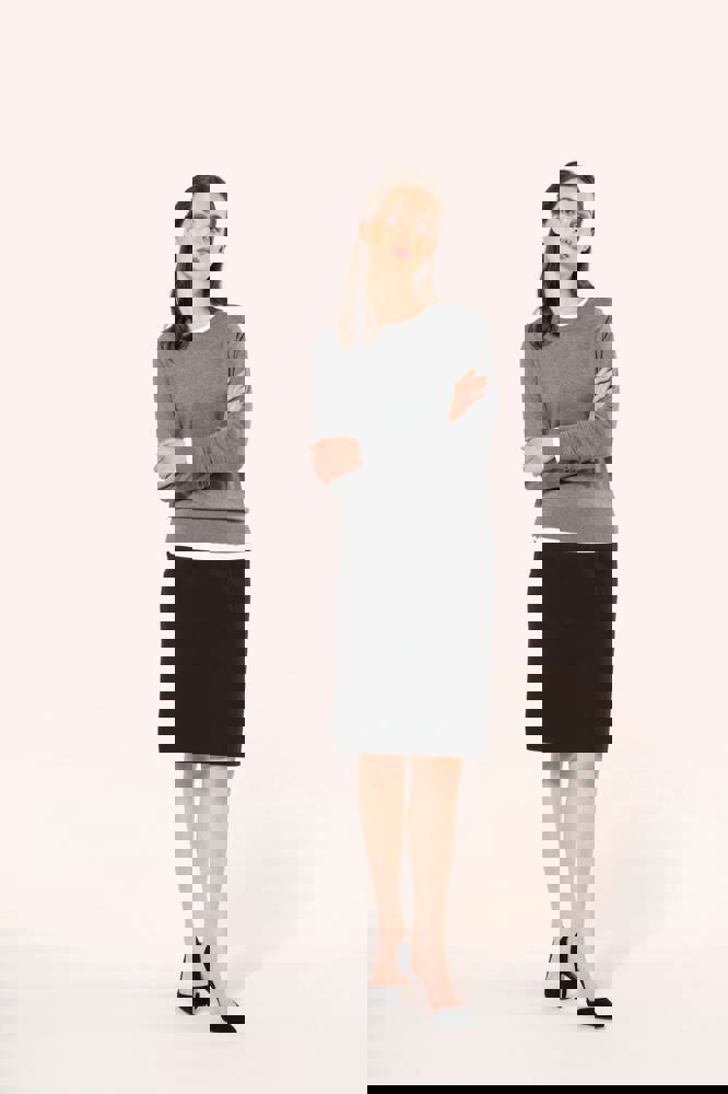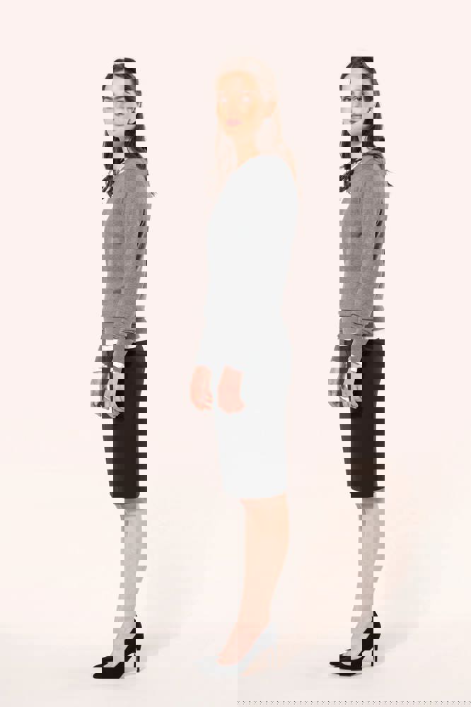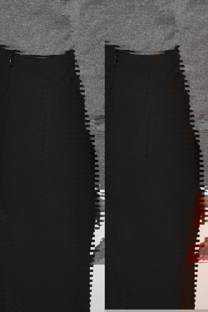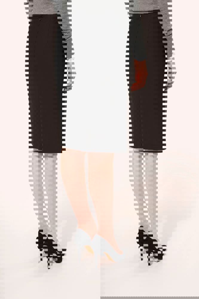 50 % Polyester/23 % Viskose/22 % Wolle/5 % Elasthan. Futter: 100 % Stretch-Polyester. 2 Abnäher vorn an der Taille und 2 am Rücken. Reißverschluss am Rücken, der innen verdeckt ist, mit Knopf für mehr Komfort. Schlitz hinten am Saum des Rocks, Volant-Futter mit Schlitz. Gerader Schnitt. Kein Markenetikett, nur Größenkennzeichnung für eine leichtere Veredelung.
