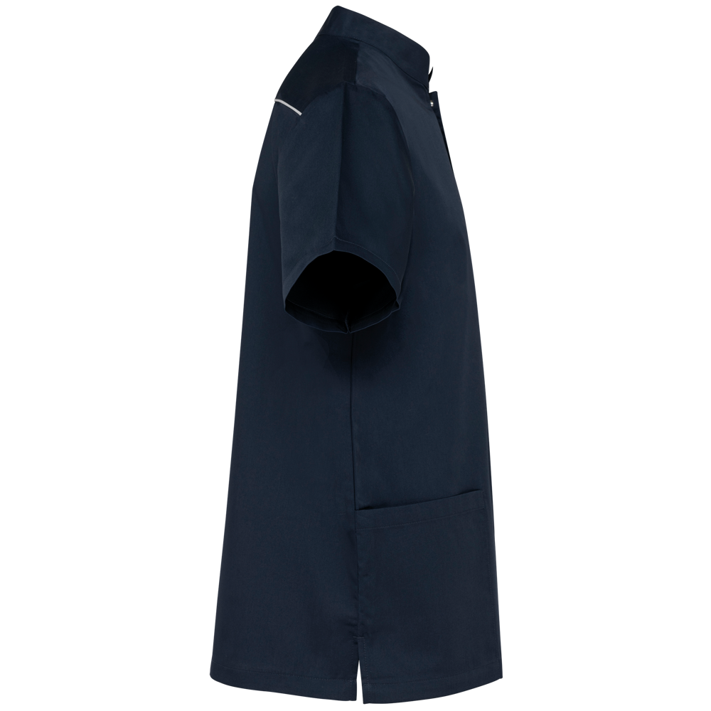 65% Polyester / 35 % Baumwolle. Twill aus Polyester-Baumwolle. Waschbar bei 60 °C. Gerader Schnitt. Mandarinkragen. Verschluss auf der Vorderseite mit Druckknöpfen. 1 aufgesetzte Brusttasche mit Stiftfach. 2 große aufgesetzte Taschen auf der Vorderseite, wobei eine (links) ein doppeltes Fach hat (Innenfach mit kontrasfarbenem Rand). Kontrastfarbene Paspel auf der Verschlussleiste und in der Rückenpasse. Namensetikett auf der Innenseite. 2 seitliche Gehschlitze. Markenetikett zum Abreißen.