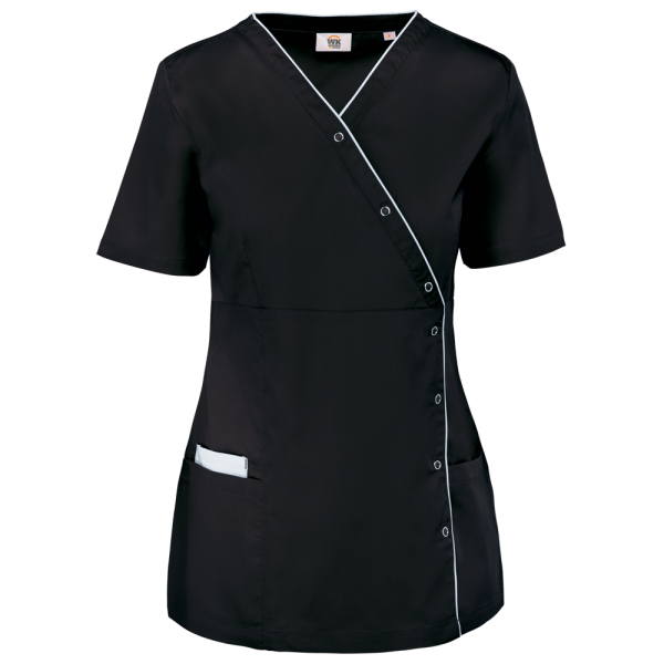 65 % Polyester / 35 % Baumwolle. Twill-Gewebe aus Polyester-Baumwolle. Waschbar bei 60°C. Gerader Schnitt mit Abnähern vorn und hinten für einen femininen Schnitt. V-Ausschnitt, asymmetrischer Verschluss mit Druckknöpfen. 2 Taschen auf der Vorderseite, wobei eine (rechts) ein doppeltes Fach hat (Innenfach mit kontrasfarbenem Rand). Kontrastfarbene Paspel am Ausschnitt und entlang der Verschlussleiste. Namensetikett auf der Innenseite. Markenetikett zum Abreißen.