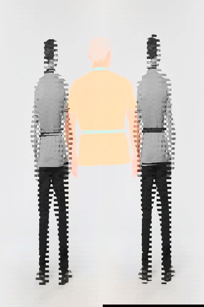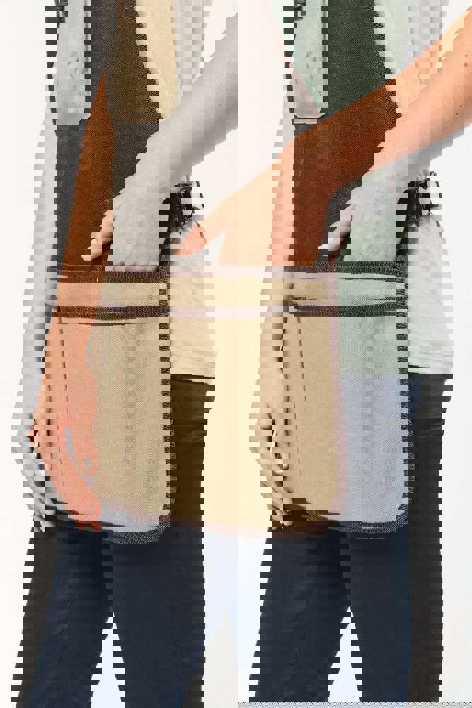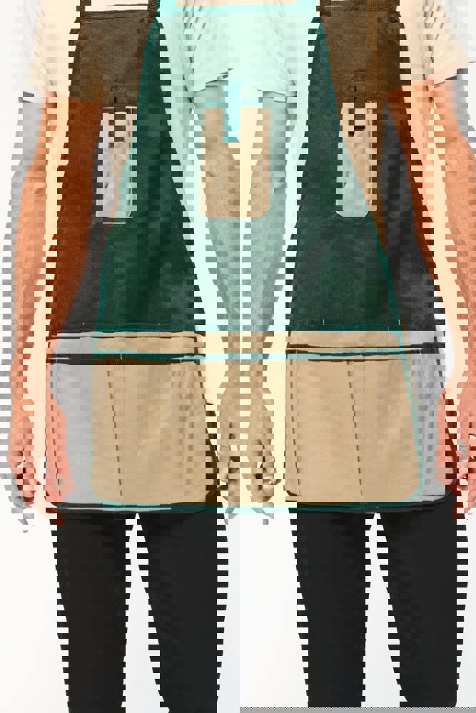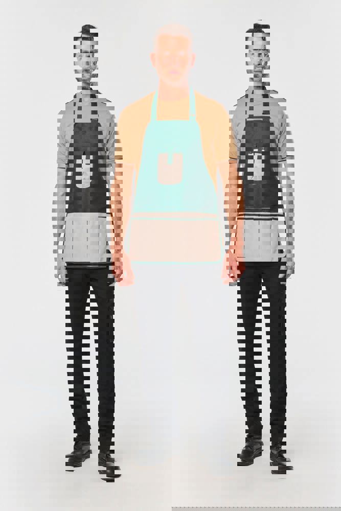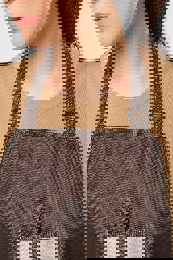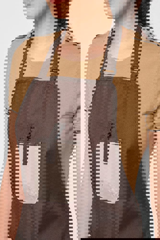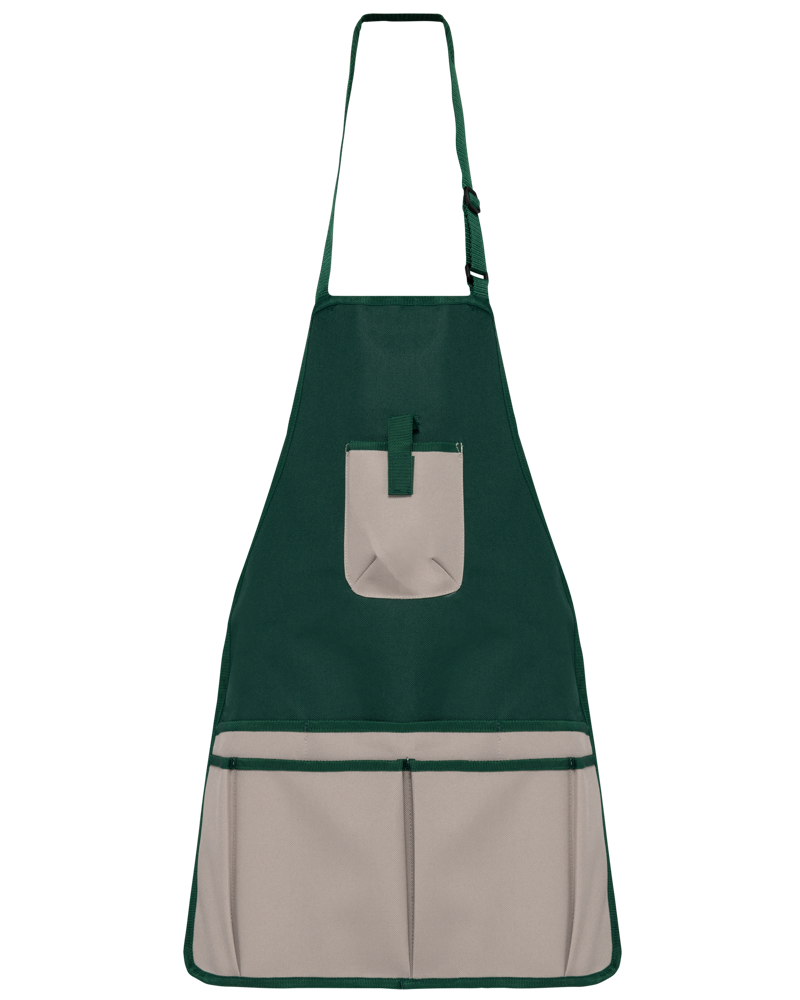 100 % Polyester. Aus 100 % recyceltem Polyester. Beschichteter, bis 4.000 mm vollständig wasserdichter Oxford-Stoff. 7 offene Taschen auf zwei Ebenen mit kontrastfarbenem Schrägband. 1 Brusttasche mit Klettverschluss. Mit Verstellriemen und Schnalle aus recyceltem Kunststoff am Hals und an der Taille größenverstellbare Schürze. Gesamtlänge der Schürze = 60 cm. Breite des Schürzenunterteils = 46 cm.