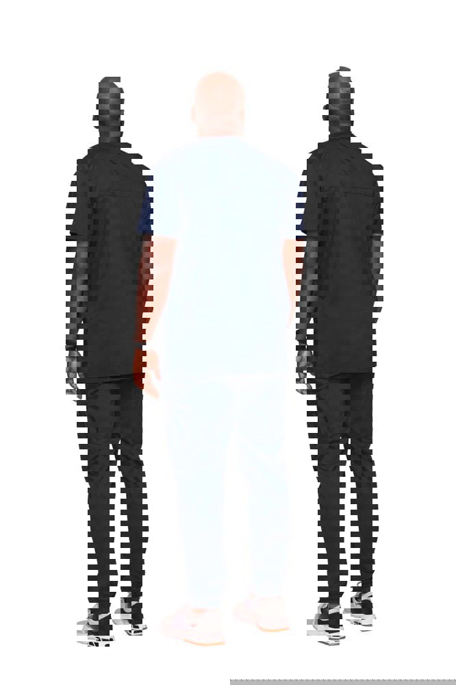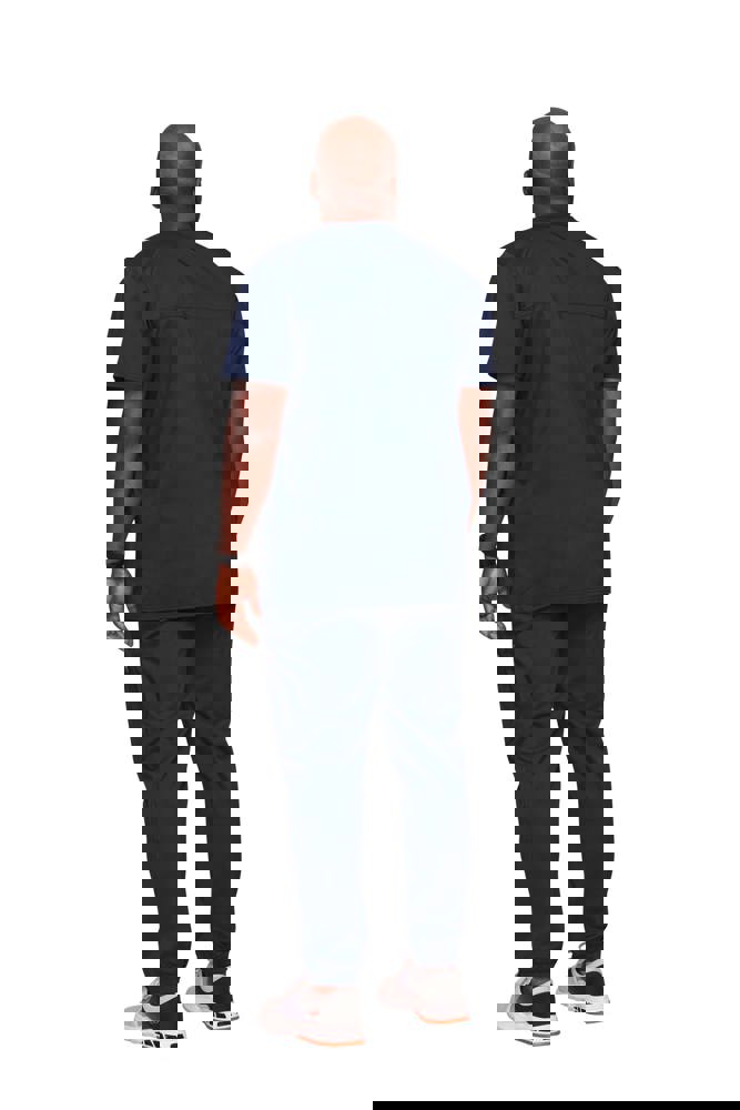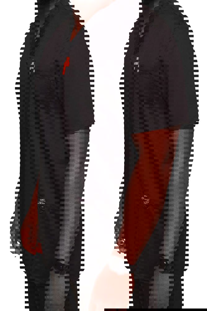 78 % Polyester/20 % Viskose/2 % Elasthan. Sergestoff. Herrenschnitt. Brusttasche mit Stiftschlitz. Zwei aufgesetzte Taschen. Etiketten mit Logo und elastischer Schnalle. Rückenpasse. Seitliche Belüftungen.