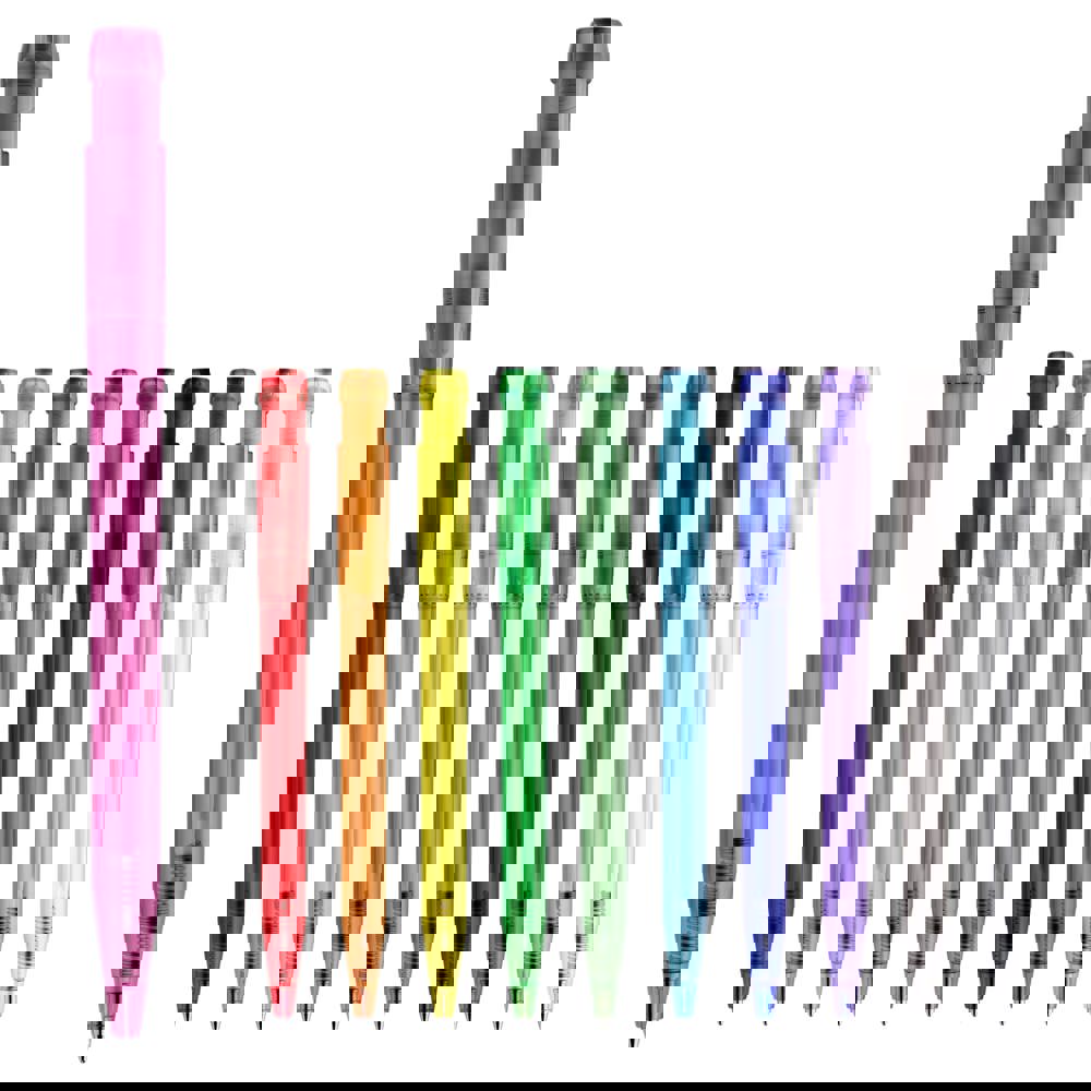 Schlanker transparenter Kugelschreiber in ansprechenden Farben. Ein schöner Werbeartikel wegen seiner Druckfläche. Mit synthetischer blau schreibender X20-Refill-Mine. Druckkugelschreiber aus ABS, hergestellt in Europa. Ab einer Abnahmemenge von 5.000 Stück sind eigene Farbkombinationen möglich.