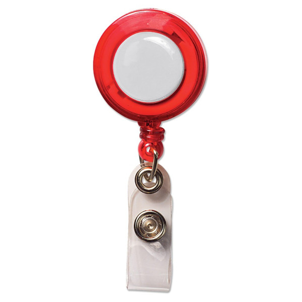 Transparenter Namensschildhalter mit Ausziehband: 50cm und Clip auf der Rückseite. Werbeanbringung mittels Doming.