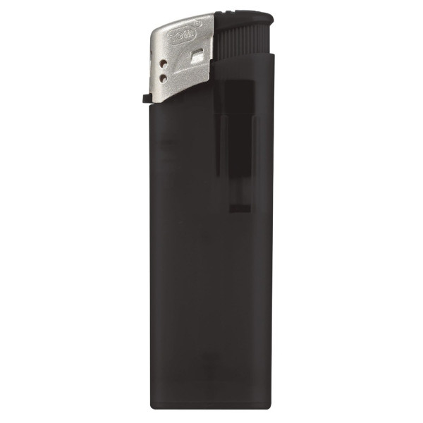 Elektronisches, nachfüllbares Feuerzeug in gefrosteten Farben mit matt silberner Kappe. Mit Kindersicherung.