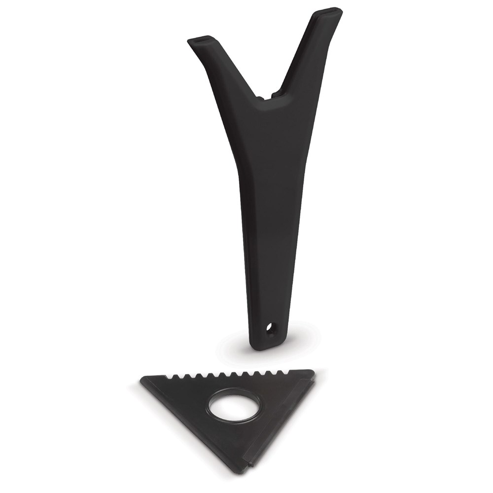 Handlicher Eiskratzer mit austauschbarem Dreieck zum Entfernen von Schnee, Eis und Kondenswasser. Der Griff hat eine große Druckfläche für ein Logo.
