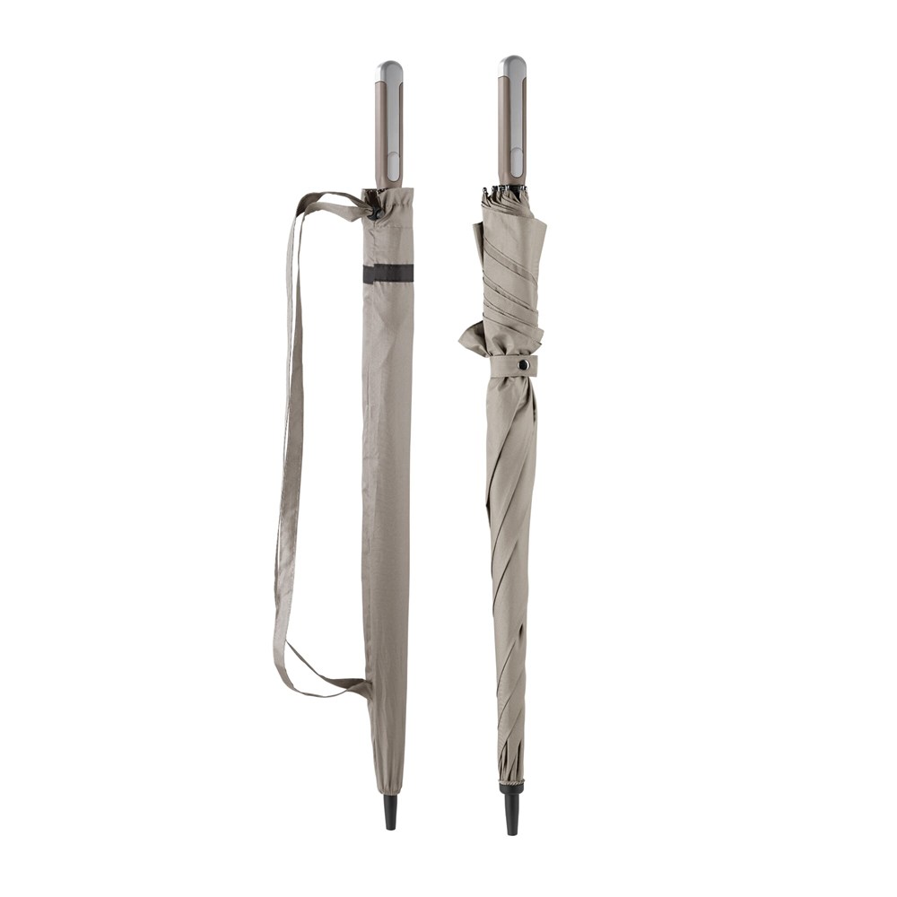 Reisen Sie stilvoll mit diesem großen und luxuriösen Regenschirm. Sein markantes quadratisches Design schafft eine größere Fläche und ist groß genug für zwei Personen. Das Gestell öffnet sich automatisch, ist voll aus Fiberglas und winddicht. Durch die praktische Tasche mit Schultergurt lässt er sich leicht mitnehmen.