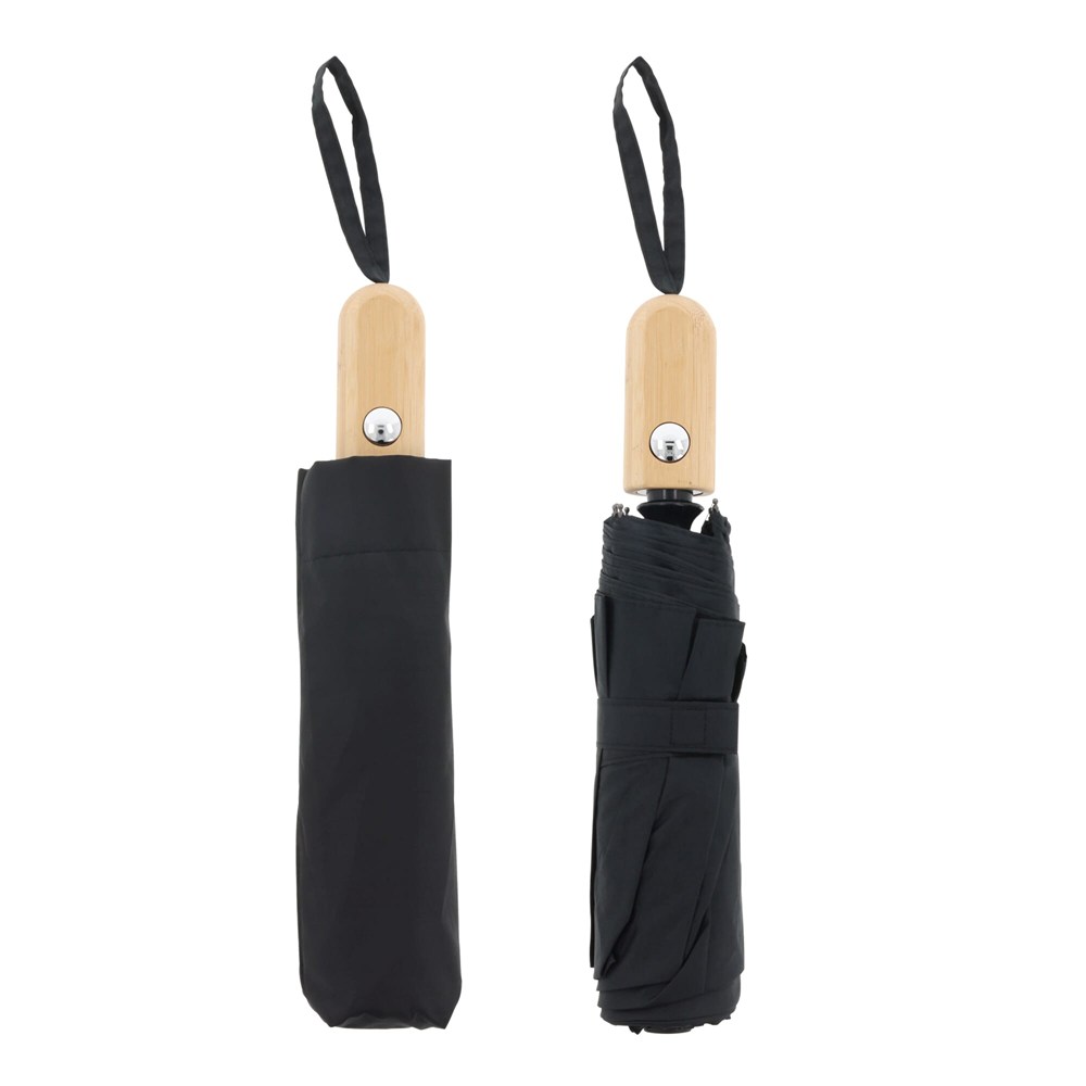 Regenschirm aus R-PET-Material mit einem stilvollen Echtholzgriff. Durch das Fiberglas-Gestänge ist der Regenschirm winddicht und er lässt sich mit einem Knopfdruck automatisch öffnen. Das melierte Material verleiht dem Modell einen luxuriösen Look. (Volltonfarbe schwarz).