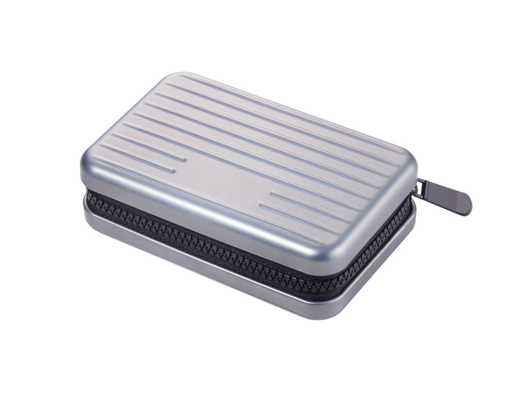 Kreditkartenetui im Stil eines Hartschalenkoffers, Reißverschluss, mit Ausleseschutz (für RFID Chips), 9 Fächer mit Platz für ca. 20 Karten, Geld und Belege, Aluminium, Polyester, matt, titanfarben
