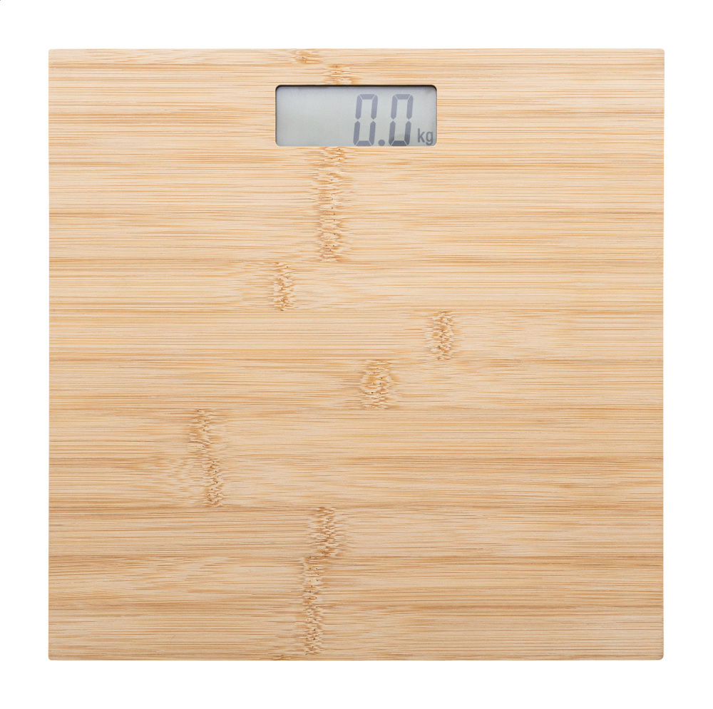 Digitale Personenwaage mit Wiegefläche aus Bambus. Tragkraft: 150kg, Einteilung: 0,1kg, Maßeinheiten: kg/lb/st. Mit integriertem, wiederaufladbarem Akku. Inklusive USB-Ladekabel.