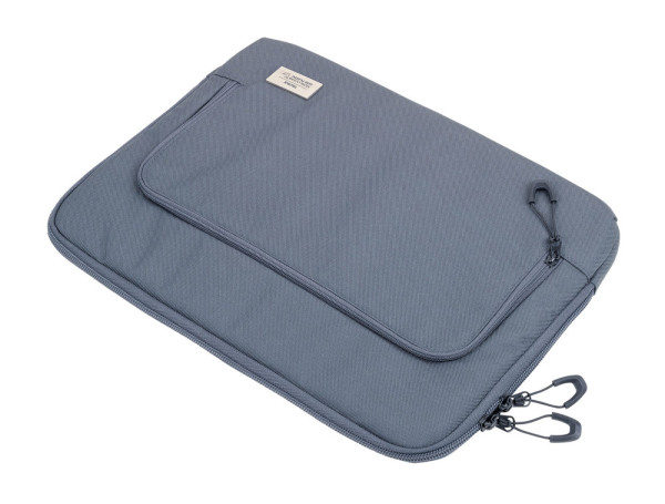 Laptoptasche aus recyceltem Meeresplastik, mit 2 Reißverschlussfächern, 1 großes Fach für Laptop, Tablet, Dokumente (bis zu 14''), mit Tragegriff, separatem Elastikband zur Organisation und zusätzlichem Aufprallschutz durch gepolsterte Ecken, 1 kleines Fach für Zubehör mit 2 Fächern und Elastikbändern, inkl. Geheimfach für mini Tracking-Geräte (z.B. APPLE AirTag®), Schlaufe zur Befestigung am Trolley, 100% rPET, recyceltes Meeresplastik, dunkelgrau