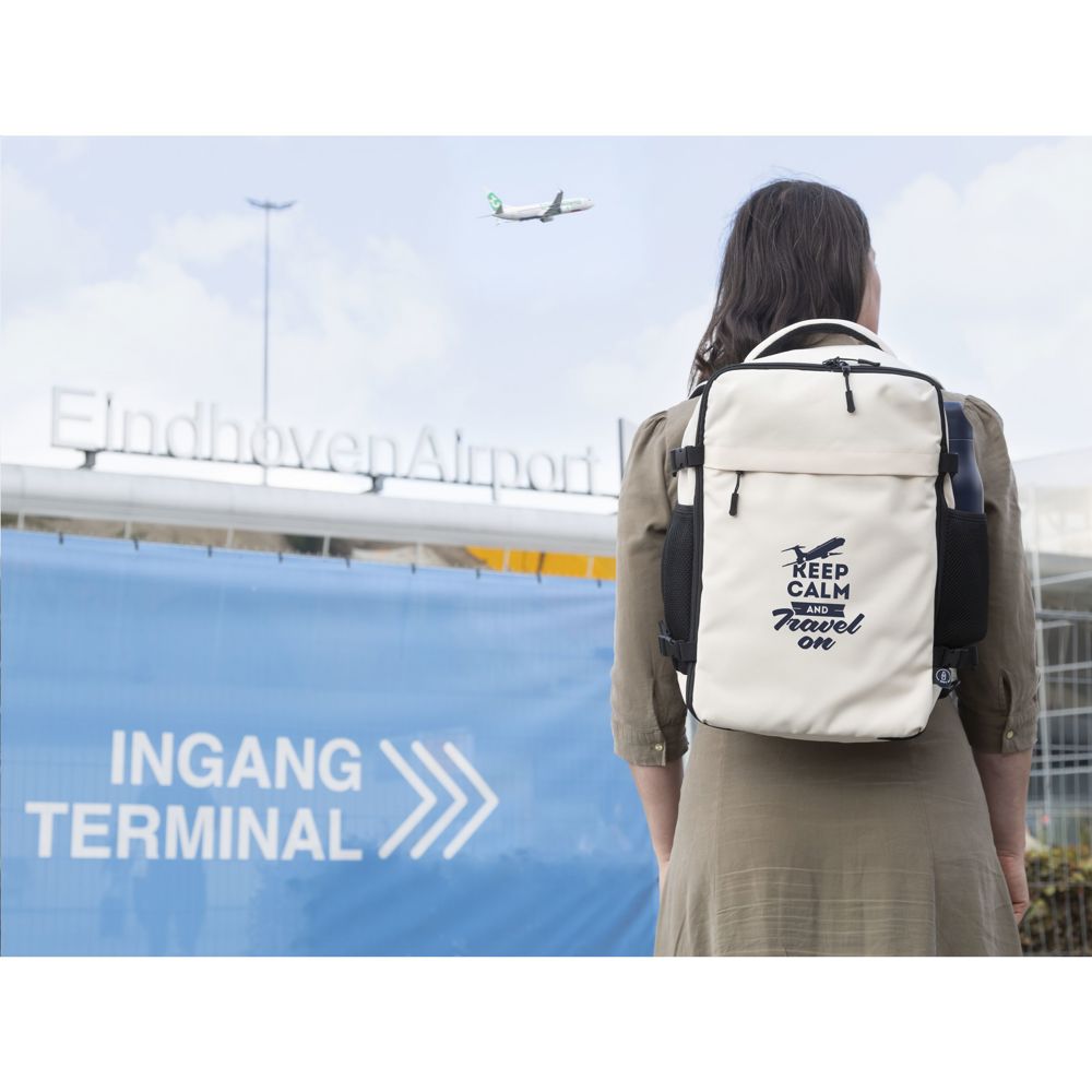 Dieser kompakte und vielseitige Cabin Flight Rucksack wurde als Handgepäck für alle Fluggesellschaften entwickelt. Er passt problemlos unter jeden Flugzeugsitz. Mit einem Fassungsvermögen von ca. 20 Litern bietet der Rucksack überraschend viel Stauraum, während sein geringes Gewicht für hohen Tragekomfort sorgt. Die Außenseite besteht aus robustem recyceltem RPET 900D-Polyester. Komplett gefüttert mit recyceltem RPET 210D-Polyester. Das geräumige Hauptfach mit Reißverschluss und doppelten Schiebern ist ideal für Kleidung und verfügt über einen praktischen Organizer für Telefon, persönliche Dokumente und andere wichtige Dinge. Ein zusätzliches gepolstertes Laptopfach bietet sicheren Schutz für Laptops bis zu 15,6 Zoll. Die Tasche hat auf beiden Seiten elastische Netztaschen, ideal für eine Wasserflasche oder kleine Accessoires. Auf der Rückseite befindet sich ein zusätzliches Reißverschlussfach. Die Schultergurte sind oben in diesem Reißverschlussfach befestigt und unten mit einem Karabinerhaken verschlossen. Durch Lösen der Haken können die Gurte vollständig im Reißverschlussfach verstaut werden, wodurch die Tasche noch kompakter wird. Die verstellbaren, gepolsterten Schultergurte, das gepolsterte Rückenteil und der stabile Griff mit Mesh-Futter sorgen für optimalen Tragekomfort, auch auf längeren Reisen. Inklusive abnehmbarem Schultergurt. Ein integrierter Trolley-Gurt erleichtert das Befestigen des Rucksacks an einem Koffer. Dieser Rucksack ist der perfekte Begleiter für jede Flugreise. GRS-zertifiziert. Gesamtes recyceltes Material: 50%.
