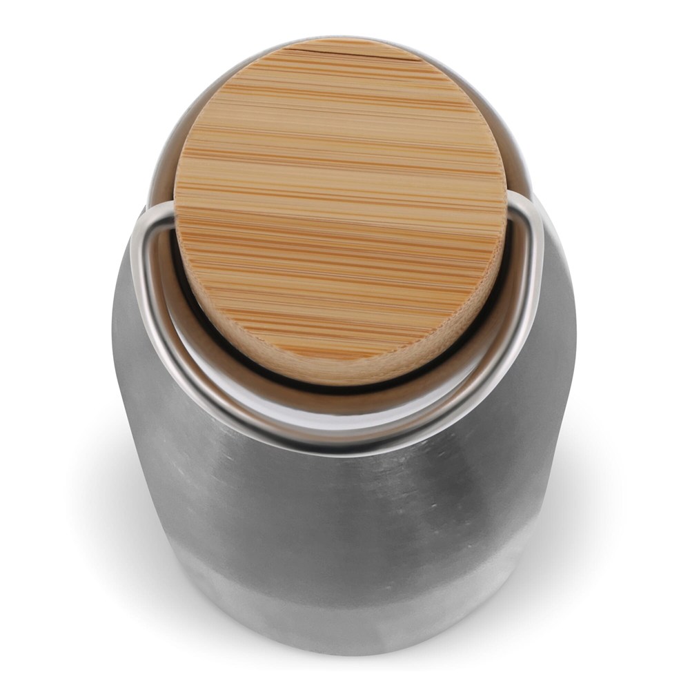 Doppelwandige Vakuum-Isolierflasche mit Holzdeckel. Mit einer matten Beschichtung für ein modernes Finish.