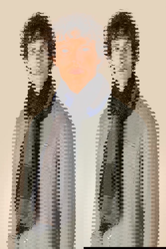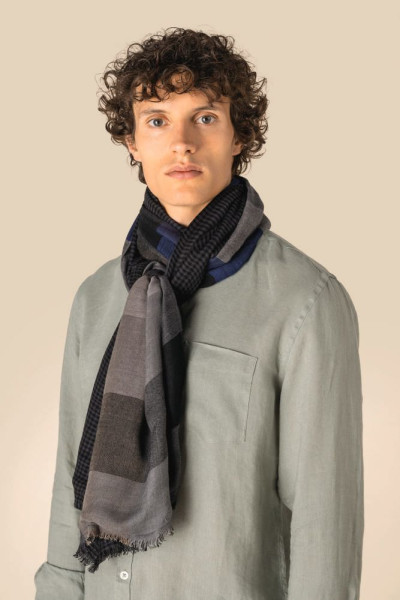 100 % Viskose. Gewebtes Schal mit Fransen. Wendbarer Doubleface-Stoff: eine Seite mit kontrastierenden kleinen Karos, die andere Seite mit einem größeren Karomuster in Beige, Blau und Grau. Unsere handgewebten Kopftücher können leichte Farbabweichungen von einem Stück zum anderen aufweisen, was ein Zeichen für unsere authentische Handwerkskunst ist.