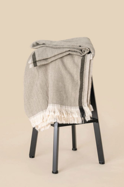 100 % Baumwolle. Maße: 135 x 195 cm (Variationen je nach Komplexität der Webart möglich). Gewaschenes Produkt. Fouta mit Fransen an den Enden. Doppelseitig gewebt mit Materialeffekt, eine Seite heller in Beigetönen. Zierstreifen, von denen einige an den Enden kontrastreich abgesetzt sind.