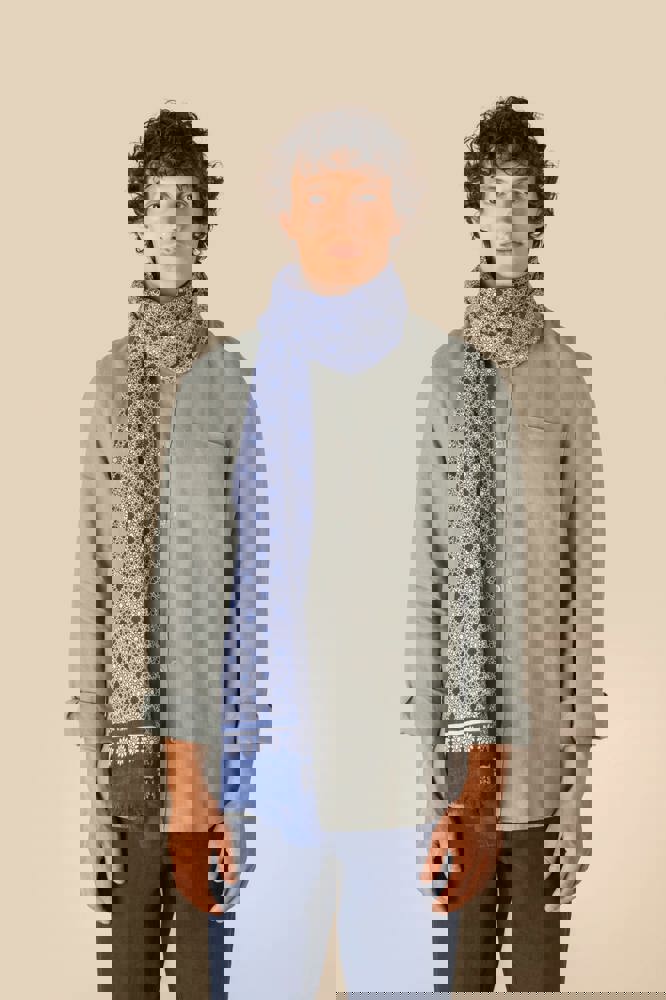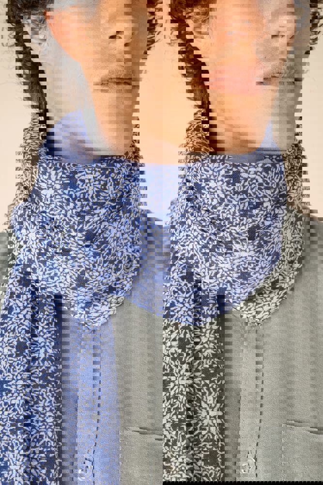100 % Baumwolle. Gewebtes Schal mit Fransen, verziert mit weißen Blumenmustern im Mosaikstil auf einem blauen Hintergrund. Unsere handgewebten Kopftücher können leichte Farbabweichungen von einem Stück zum anderen aufweisen, was ein Zeichen für unsere authentische Handwerkskunst ist.