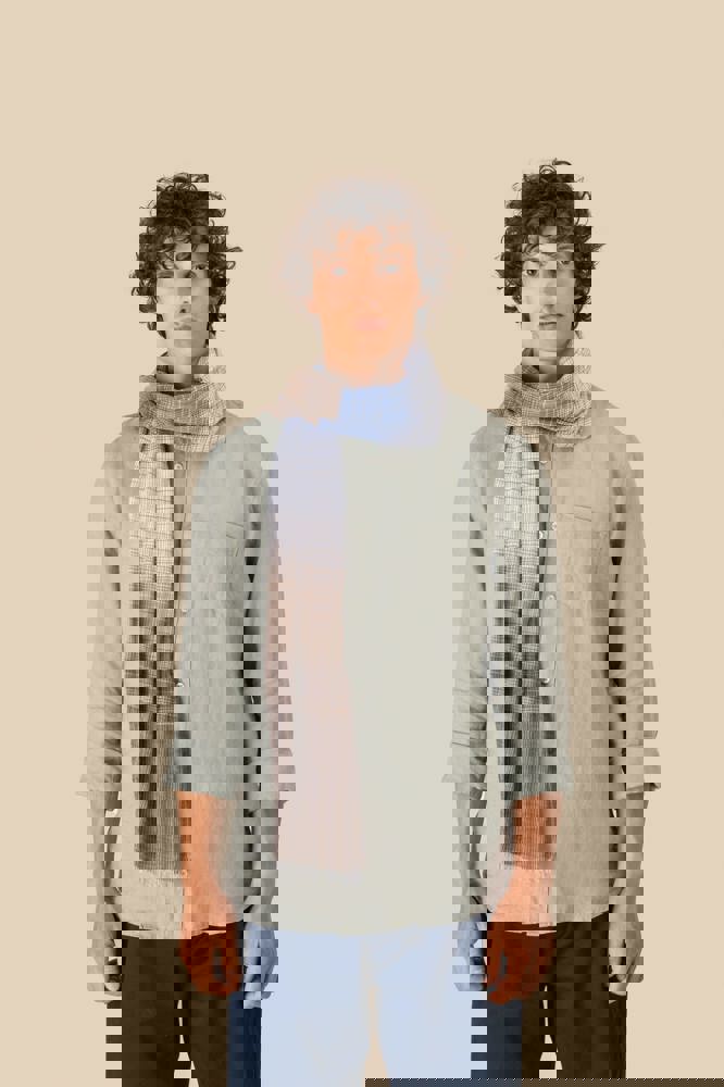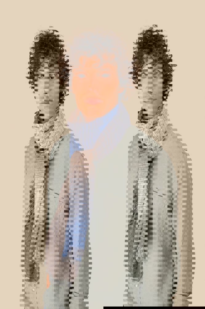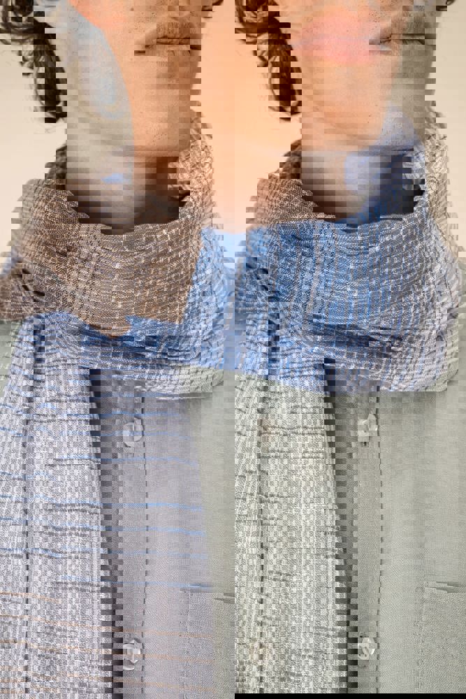 100 % Baumwolle. Gewebtes Schal mit Fransen, verziert mit grafischen Mustern mit blauen, braunen und grauen Streifen. Unsere handgewebten Kopftücher können leichte Farbabweichungen von einem Stück zum anderen aufweisen, was ein Zeichen für unsere authentische Handwerkskunst ist.