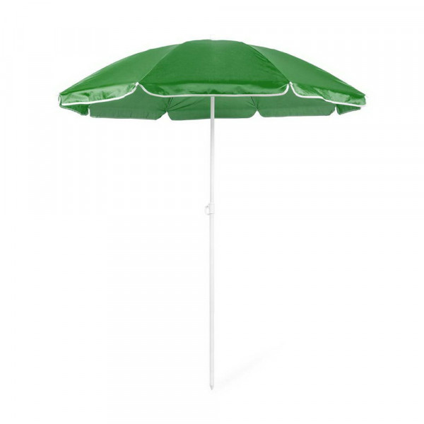Sonnenschirm mit 8 Panelen aus robustem Nylon in verschiedenen lebendigen Farben. Mit einem Durchmesser von 150 cm, Paspelierung an den Rändern und höhenverstellbaren Metallrohren in Weiß. Präsentiert in einer PVC-Hülle mit Schultergurt.
