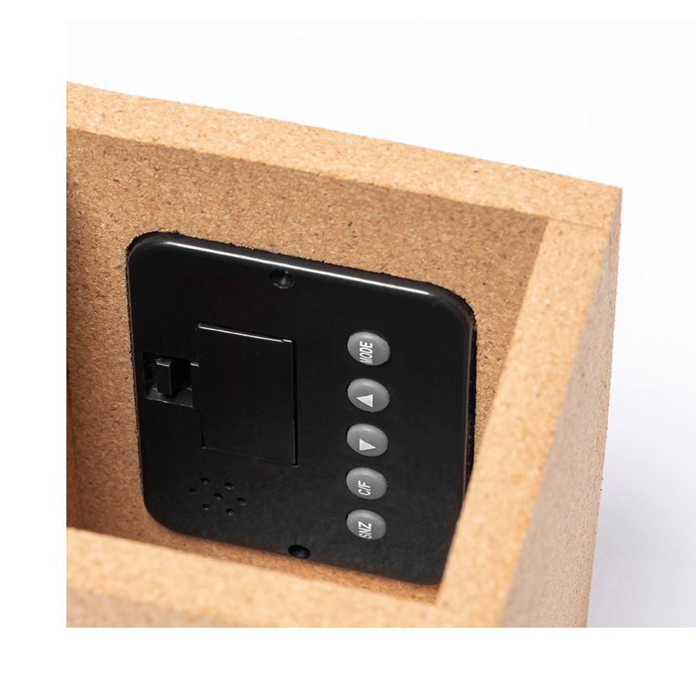 Linie "Natur" Stifthalter mit integrierter Multifunktionsuhr. Aus Naturkork, mit Thermometer, Kalender und Alarmfunktion. Batteriebetrieben (Knopfbatterien im Lieferumfang enthalten) und in einer attraktiven Öko-Design-Box präsentiert.