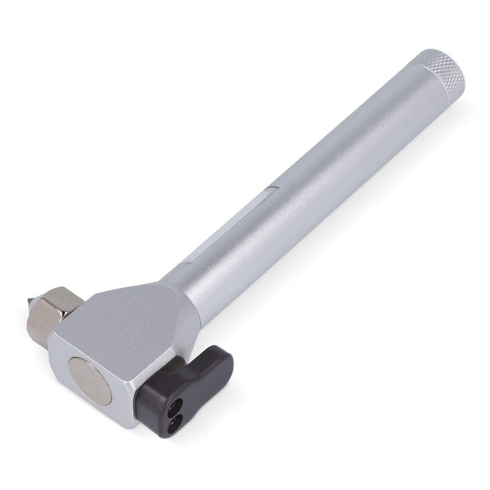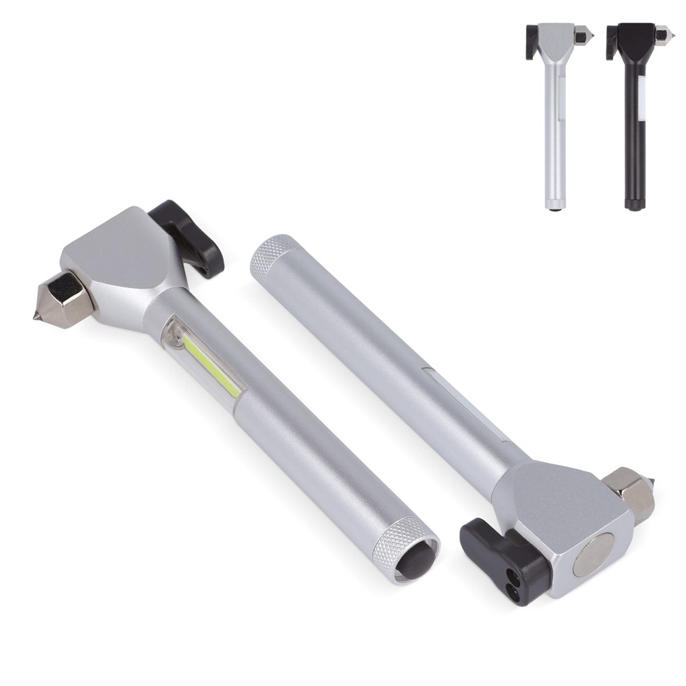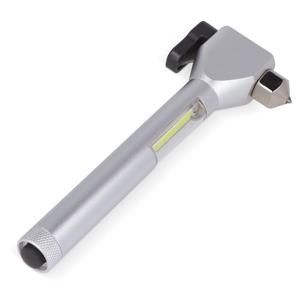 Dieser Nothammer ist mit einer Spitze aus Stahl zum einschlagen einer Autoscheibe, einem scharfen Sicherheitsgurtschneider, einem Magneten und einem COB-Licht ausgestattet. Dieser Rettungshammer sollte im Notfall nicht im Auto fehlen. Mit dem Magneten können Sie den Nothammer am Metall befestigen, um die Hände frei zu haben.