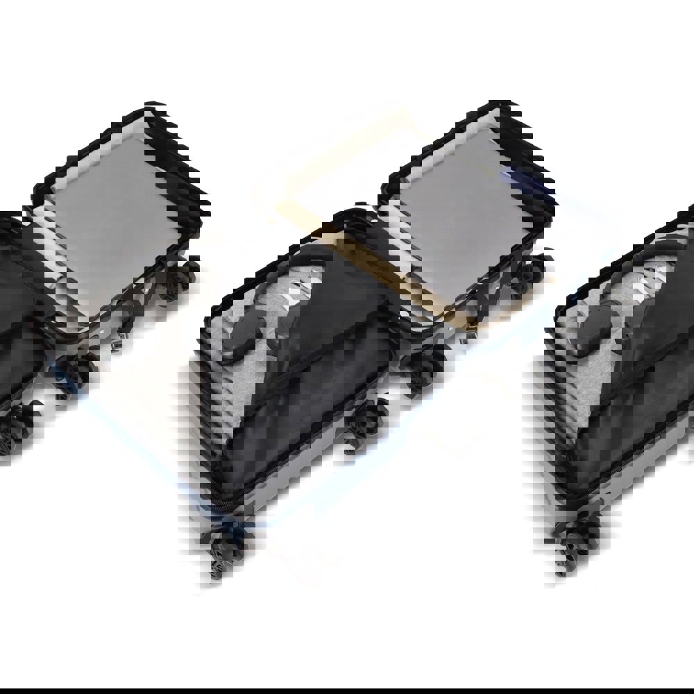 Dieser Kabinentrolley vereint Stauraum und Benutzerfreundlichkeit. Er passt in die meisten Flugzeugfächer und hält wichtige Utensilien griffbereit. Mit vier Lenkrollen, Zahlenschloss und Handyhalterung im Griff macht er das Warten am Flughafen, Bahnhof oder Bahnsteig deutlich angenehmer.