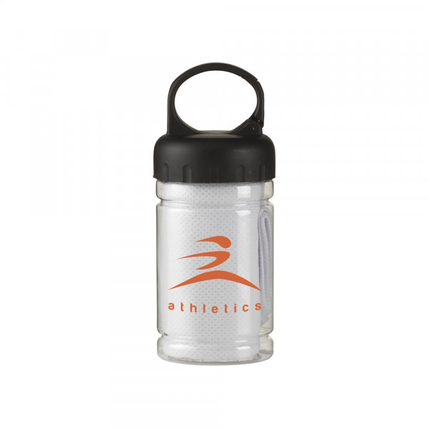 Spezielles Kühlhandtuch aus 100 % Polyester. Nach dem Eintauchen in kaltes Wasser kann dieses Handtuch bei sportlichen Aktivitäten oder Sonnenbrand kühlen. Maße 30 x 80 cm. Ideales Format, um es zur Kühlung im Nacken zu tragen. In transparentem Gehäuse mit ABS-Schraubverschluss mit Karabinerhaken.