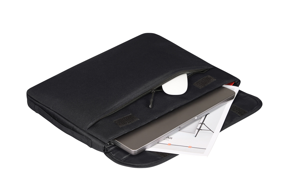 elegante Laptop-Mappe mit recyceltem Oberstoff; gepolstertes Hauptfach; gepolsterter Deckel mit Klettverschluss; große Vortasche mit Reißverschluss; innen AirTag-Fach; rückseitige Schlaufen zur Befestigung individueller Accessoires, z. B. Schultergurt (nicht im Lieferumfang); ergonomischer Handgriff rückseitig, zur Fixierung am Trolley-Gestänge geeignet; flacher seitlicher Handgriff zum einfachen Herausheben, z. B. aus Rucksäcken