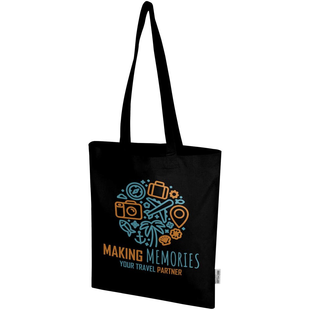 Die Peru Blend Tragetasche besteht zu 60 % aus GRS zertifizierter Recyclingbaumwolle und zu 40 % aus GRS zertifiziertem RPET mit einer Stoffdichte von 180 g/m². Sie ist robust und strapazierfähig und somit ideal für den täglichen Gebrauch. Sie verfügt über ein großes Hauptfach, das maximale Sichtbarkeit für jedes Logo bietet. Das robuste Material ermöglicht den Transport schwererer Gegenstände (bis zu 5 kg). Die 30 cm langen Schultergriffe sorgen für bequemes Tragen. Die für diese Tragetasche verfügbaren Druckverfahren sind ebenfalls GRS zertifiziert, sodass eine transparente und vollständig zertifizierte Lieferkette garantiert ist.