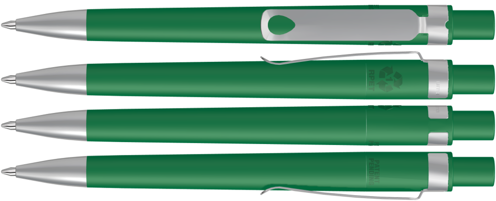 Druckkugelschreiber aus recyceltem PET-Material mit matt gedecktem Gehäuse. Metallclip und Metallspitze matt verchromt.