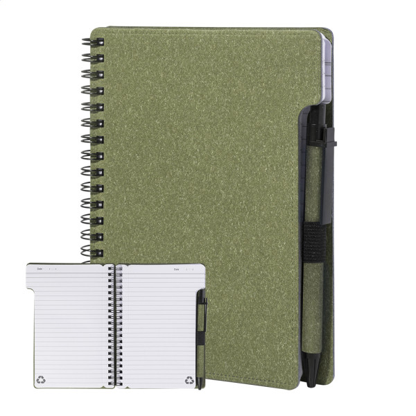 Spiralnotizbuch aus Recyclingpapier mit 80 Blättern (liniert). Format A6. Inklusive Recyclingpapier und Kugelschreiber aus Recycling-PP, blauschreibend.