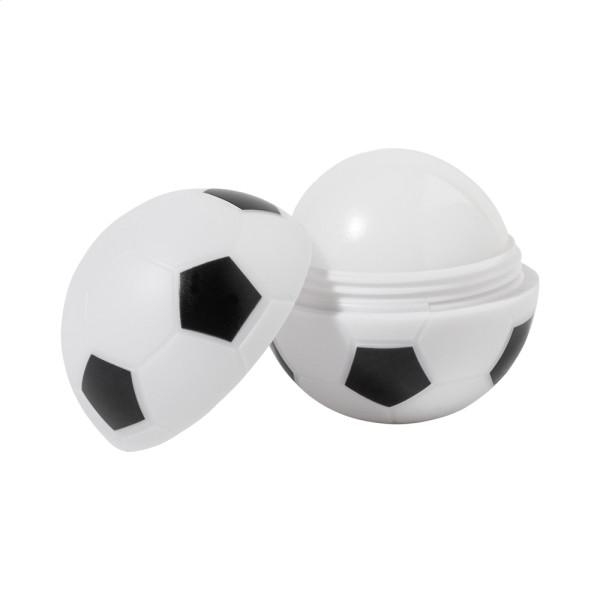 Vanille-Lippenbalsam in fussballförmiger, metallisch glänzender ABS-Hülle, mit Lichtschutzfaktor 15. Das Produkt enthält keine Inhaltsstoffe tierischen Ursprungs.