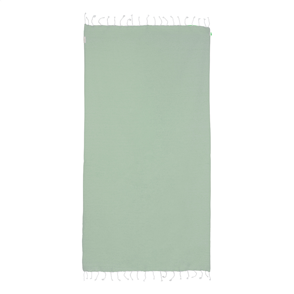Pareo-Strandtuch. Material: 70 % recycelter Baumwolle und 30 % RPET-Polyester (180 g/m²).