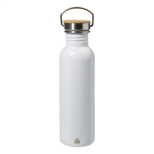 Trinkflasche aus recyceltem Edelstahl mit Bambus-Tragedeckel. Füllmenge: 750 ml.